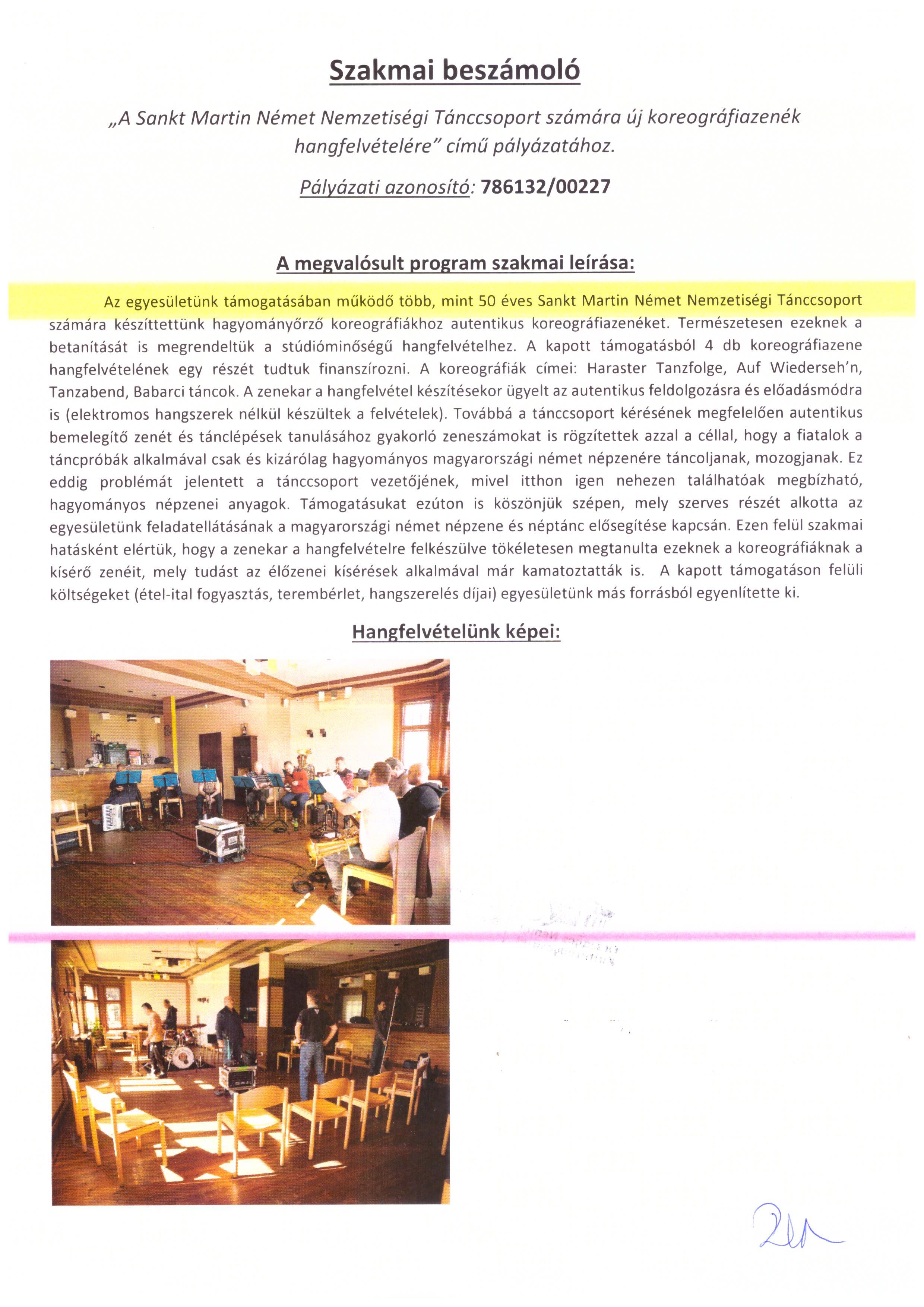 Az egyesületünk támogatásában működő több, mint 50 éves Sankt Martin Német Nemzetiségi Tánccsoport számára készíttettünk hagyományőrző koreográfiákhoz autentikus koreográfiazenéket. Természetesen ezeknek a betanítását is megrendeltük a stúdióminőségű hangfelvételhez. A kapott támogatásból 4 db koreográfiazene hangfelvételének egy részét tudtuk finanszírozni. A koreográfiák címei: Haraster Tanzfolge, Auf Wiederseh’n, Tanzabend, Babarci táncok. A zenekar a hangfelvétel készítésekor ügyelt az autentikus feldolgozásra és előadásmódra is (elektromos hangszerek nélkül készültek a felvételek).